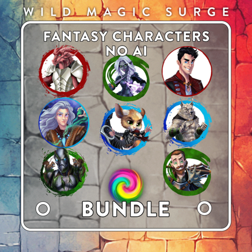 7 Unique Character Tokens: Featuring Wolf-folk, Drow, Spell Caster, Red/Topaz, Green/Emerald, White/Silver, and Black characters.