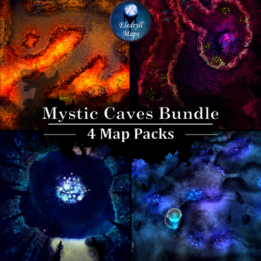 Surprise your players with visual tales of enchanted and strange caverns. Uncover shimmering crystals, starlit lakes, glowing trees, dangerous magma flows, underground rivers, lakes of acid, giant webs and eldritch horrors (amongst others) in this four map packs bundle all about exploring dark and forgotten places!