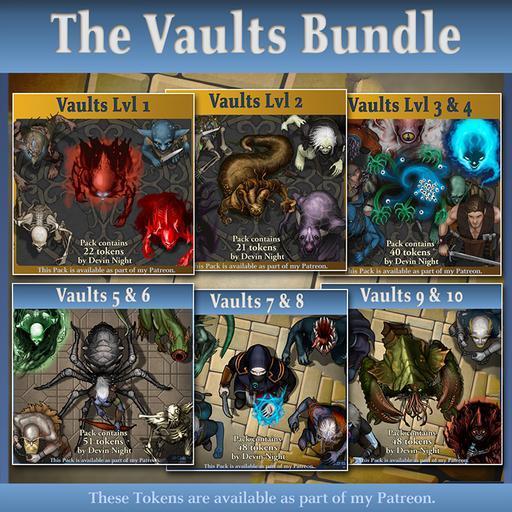 This bundle contains all the tokens for the exciting Vaults. All 10 levels of monsters. Can be used for any adventure with a large variety of monsters of all CR ratings.