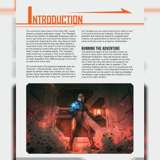 Deepnight Endeavour: The Travellers board a derelict exploration vessel to locate fuel. With no way to get home, they discover there are survivors, and that the ship has taken aboard a malevolent entity seeking to reach an inhabited planet. The Travellers might simply try to escape or they could attempt to destroy the entity, but they will face opposition from the original crew as well as the entity itself.