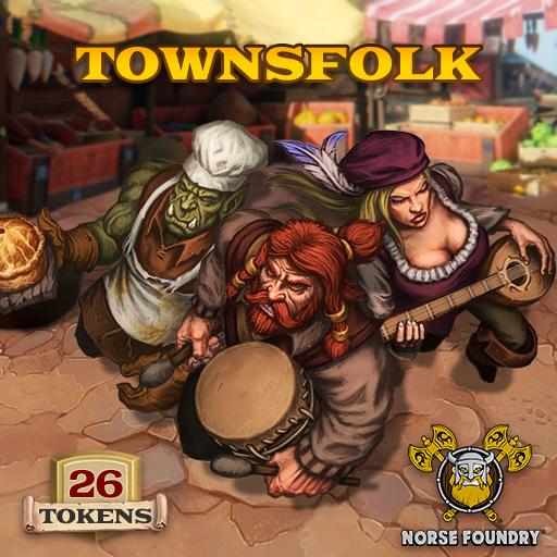 Just another town in the realm - or is it? Build your own mysterious town with this bundle of 109 tokens. You need guards? Got them. You need royalty? Got them. You need butchers, bakers and a shady map maker? Got them. And many more! Take your Roll20 Game to the next level. Professional art from the Norse Foundry art team. Any backing for this will go towards making future tokens, maps and adventures and supporting our artists. We appreciate your support! Don't forget to check out the dice and accessories on our website.