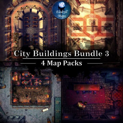 Big bustling cities often come with creeping political intrigues, a plethora of NPCs and MANY opportunities for player induced shenanigans. This bundle comes with four urban environments: the rumored grounds of a palace hall, the hushed secrets of the university library, the intricate plans of a warlords council and the rowdy crowds of an adventurers tavern. Focus on your characters, not on preparing for the next improvised battle!