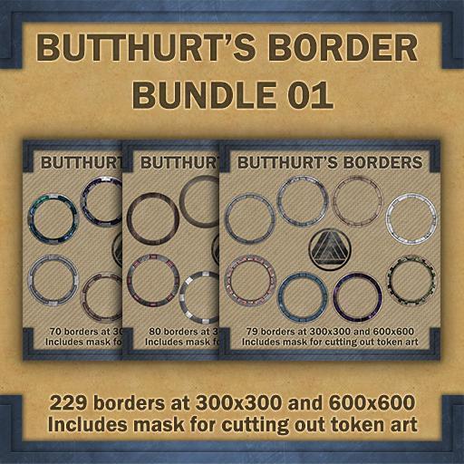 This set includes 229 token borders at both 300 by 300 pixel and 600 by 600 pixel resolutions. (458 total downloadable borders)