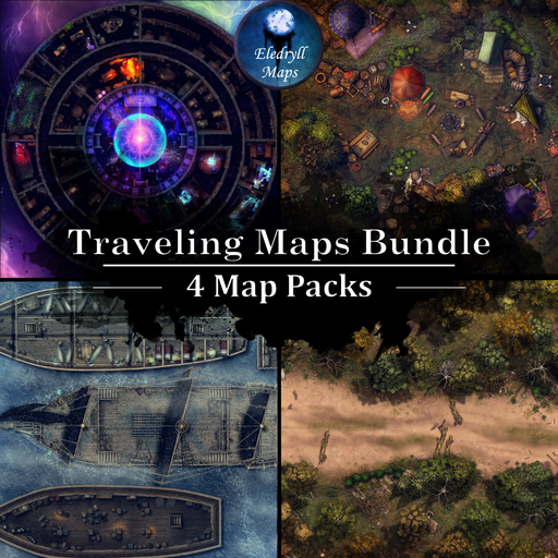 From their last epic battle and unto their next bloody encounter with the eldritch and the macabre... our players often spend a significant part of their adventures traveling through the mists of extensive worlds, discovering forgotten ruins and meeting unlikely allies. The roads, however, are not always safe and their next long rest may always be their last. This bundle of four map packs focuses on these essential moments between dungeons and cities and will let you give your party a taste of the dangers to come! Nowhere. Is. Ever. Safe.