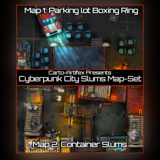 This is a Best-Value bundle collection of some of our most popular Cyberpunk maps! This Collection contains two Map-Sets, the Cyberpunk City-Slums Map Set contains two small unique locations, our Container Slums for rough street fights and our Parking Lot Boxing Ring Battle-Map. This set also contains our Cyberpunk Blood Sport Arena Map-Set, big multi-floor arena with stands for spectators and enough neon to blind you! Check out Preview Reels and Click the Sets below for more detailed information on each set!