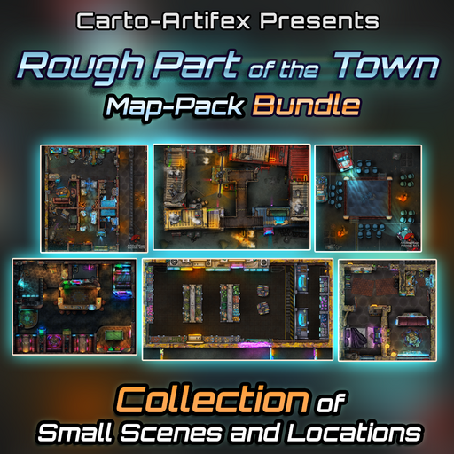 This Bundle contains three map-packs containing total of 6 unique locations with multiple layouts or alternative encounters! This set contains a Dingy Dive Bar, with total of Five alternative layouts, Two locations taking place in the Combat Zone: a container town battle-map and a parking lot boxing ring map. Set also contains our mini-map-pack of three additional locations: Corner Store, Edge Runners Apartment and Booster-Gang Hideout.