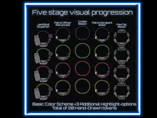 This is a perfect set to fill your token-library with, to flesh out your Night City into more vibrant, immersive experience! You can find 20 hand-drawn bordered-tokens with unique design fitting for your Police Forces! You will also find our latest roster of tokens for the Criminal elements of the City, from the lowliest scum to the toughest Ring Leaders!