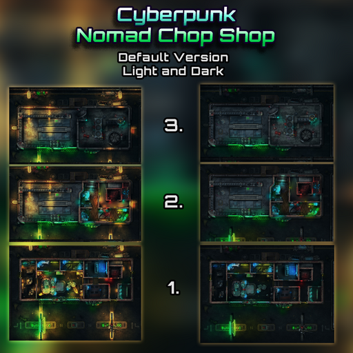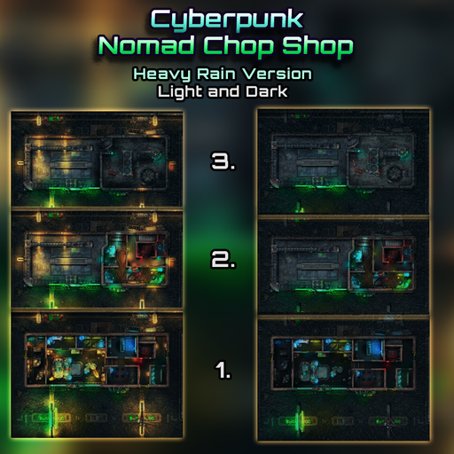 This Set contains our latest and largest single location map-pack: The Nomad Chop Shop, it contains 18 Unique Map Files spread across three Unique Themes: Dark Night/Heavy Rain/Toxic Haze.