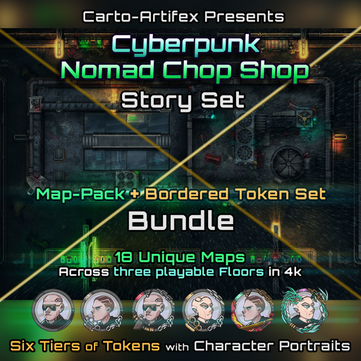 This Bundle contains one of our popular Cyberpunk themed Map-Packs along with our hand-drawn bordered tokens for your Criminal Gangs!