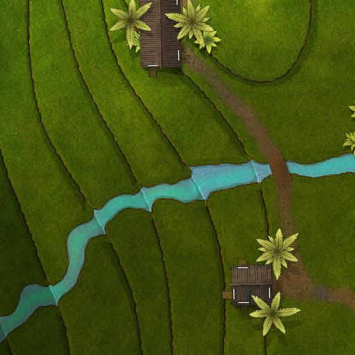 ➤ Rice Fields. [20x30] A tiered grassland farm with small huts and a stream. It is harvested by flooding, with a variant included for the flood season.