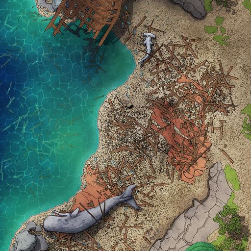 ➤ Beach Wreckage. [20x30] A powerful storm has smashed ship wreckage and unfortunate sea creatures on this stretch of beach. [🪑 Asset Variants]