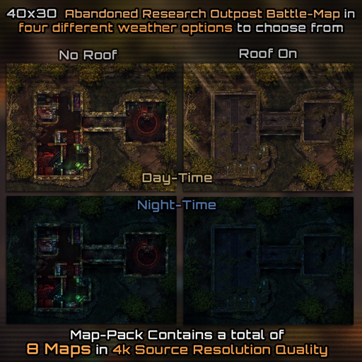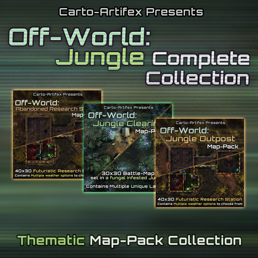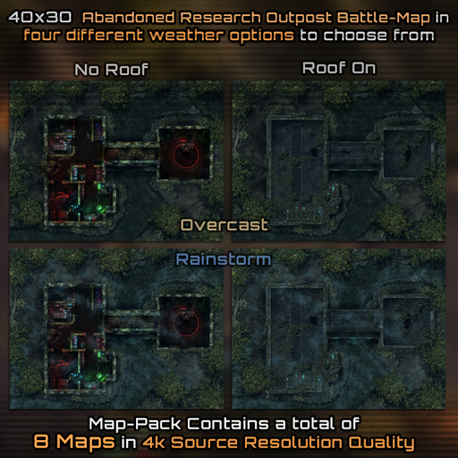 This Bundle Contains our 40x30 Jungle Outpost Map-Pack and our 40x30 Abandoned Research Station Map-Pack, both Packs contain multiple Versions and Variations to layout, theme and ambience of the map, this bundle also contains our 30x30 Jungle Clearing Map-pack with it's multiple weather options to give you solid transition scenes or extra ambush battle-arenas!