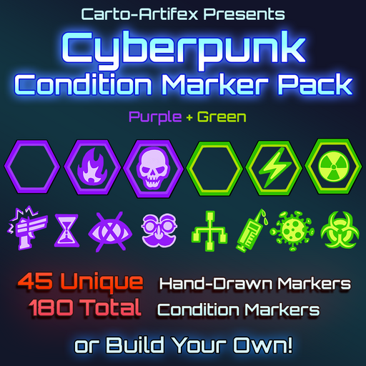 Cyberpunk Condition Marker Pack contains 180 hand-drawn condition token markers in 2 colors to fill your token marker library with the BEST Token Marker Set!