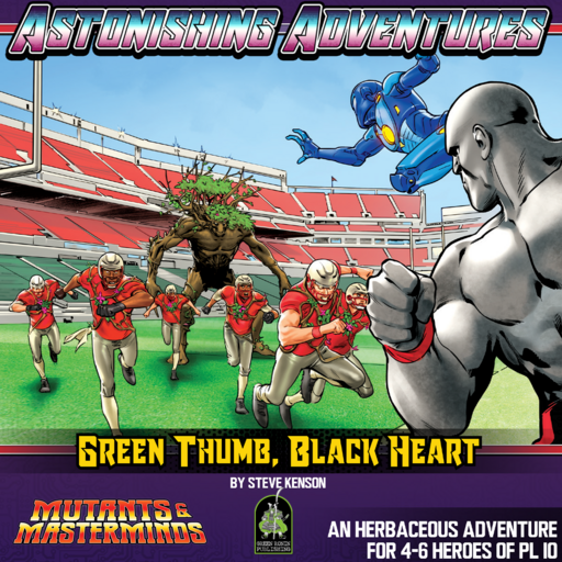 The competitive world of college sports can have a significant impact on institutions of higher learning, and the colleges and universities of Freedom City are no different in that regard. The success of a sports program can bring in huge amounts of income from ticket sales, alumni donations, sponsorships, and licensing--enough for a college to overlook some potentially dangerous practices. In this particular case, those practices hold the seeds of something truly sinister: a scheme by a supervillain to turn people into his mind-controlled minions! Can the heroes track down the source of Freedom College’s new performance-enhancing supplements before a menacing villain’s green thumb sows weeds in the city’s heart?