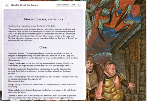 In this pun-filled Quickstart adventure for Discworld: Adventures in Ankh-Morpork, a number of dragons have been stolen from the Lady Sybil Ramkin Sunshine Sanctuary. But why? What sort of monster could have stolen these little darlings, and for what purpose?