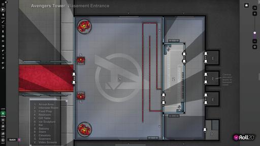 Thunderbolts maps come Dynamically-lit with doors and windows! On the left, the player view of the White Widow entering a room; On the right, the GM view of unlocking a door for the player to interact with.
