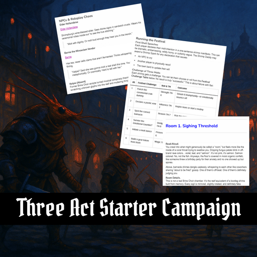 When Shrimpburg’s sacred Brine Song starts playing itself incorrectly, your party of emotionally unstable shrimp is roped, politely or otherwise, into investigating the source. What starts as a quaint community problem spirals into a trench-deep metaphysical crisis as echoes bleed, ghosts sing, and something ancient wakes up… wearing a very bad disguise.