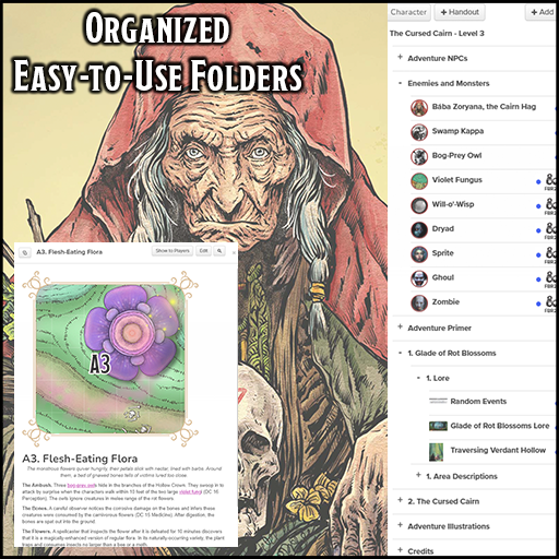 In The Cursed Cairn, the characters find Verdant Hollow Forest flooded and turned into a noxious bog. Even wildlife has been transformed into evil, more aggressive counterparts. Two crones and an elf herbalist approach the characters looking for their help. The old women claim that her sorcerous sister, a part of their broken coven, went into a forlorn tomb and dabbled with otherworldly powers. She brought ruin to the forest.