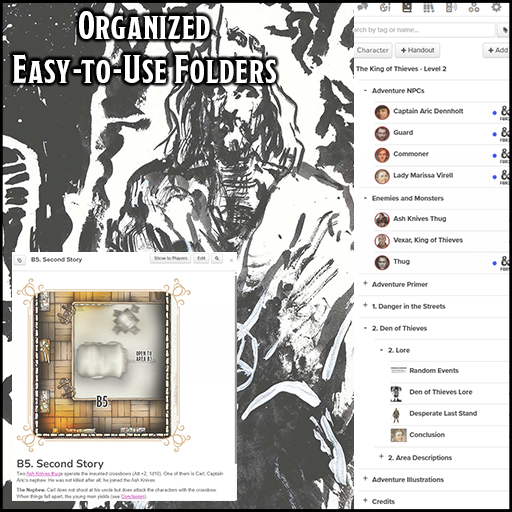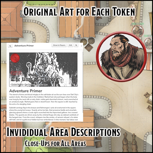 In King of Thieves, the characters are hired by the captain of the city watch to raid Cobblers' Market. They are informed that a criminal guild of increasing power and influence named the Ash Knives kidnapped two nobles. After failing to collect an outrageous ransom, the criminals hanged one of the nobles in the market. This overt action sows panic and puts the city watch in a difficult position to retain its reputation.