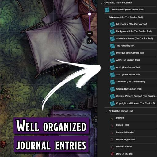 The Carrion Trail pits the players against the relentless spread of the Rot. From forests strewn with carcasses, to a night of broken rest under constant assault, and finally to a mine overtaken by crimson corruption, the adventure drives the party toward a climactic battle with the Maw of the Rot. Alongside the Severed, they must endure overwhelming ambushes, survive exhaustion, and face the embodiment of hunger made flesh.