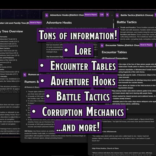This codex includes full lore, mechanics, and monster stat blocks for the Za’straszi, the first race claimed by the Void God, Za’strasz.