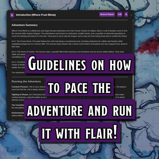 Where Frost Binds is a 5th edition, level 8 adventure set in the desolate north. It blends survival, siege tactics, and high-stakes objectives as the players navigate cult ambushes, elemental monsters, and an ancient magical prison. Will they hold the line and keep Sirigosa chained, or will the tundra echo with her roar once more?