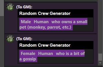 - Random Crew Generator, use our prebuilt macro to generate a general description of a crew member with a single click.