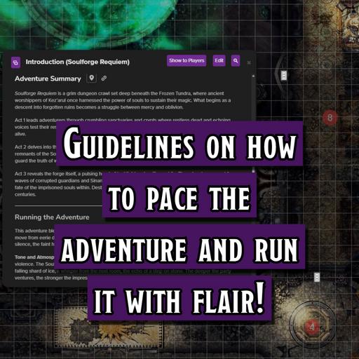 Soulforge Requiem is a 5th edition, level 7 dungeon adventure set in the Frozen Tundra of Latakar. Designed for 1 to 2 sessions (4 to 6 hours total), it blends puzzle-solving, lore discovery, and multi-wave combat encounters. Ideal for parties who enjoy tragic storytelling, tactical challenges, and decisions that leave a lasting mark on the world.