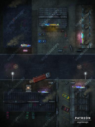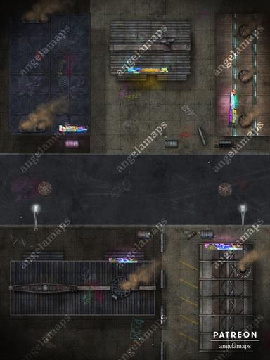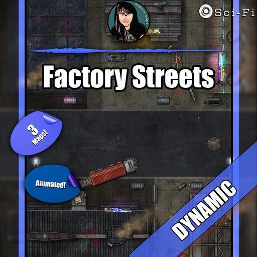 Hit the streets! The air may be choked with acrid smoke, the roads unmarked and dangerous, and the local denizens less than friendly, but this is a place of business, and business doesn’t need to be pretty. What manufactured output flows from these insalubrious halls of industry – food products, machinery, weapons, or goods far more pernicious still? Perhaps the local dive where exhausted workers and disenfranchised locals linger might hold the answers. Available in two variants, the streets at night and by day without vehicles, this fully animated map is sure not to meet the slightest environmental guideline!