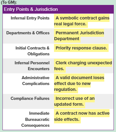 Ways characters are legally, administratively, or procedurally drawn into the infernal system — often without immediate awareness of the consequences.