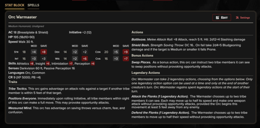 Orc Warmaster (CR 9): Strategic battlefield commanders who control positioning, timing, and coordinated attacks.