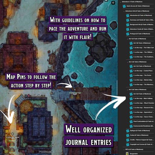A Taste of Madness is a fast-paced, three-act adventure centered on containment, escalation, and consequence. The party follows a trail of unstable culinary magic from a ruined supply cart, into a town overwhelmed by panic, and finally into a hidden laboratory where forbidden techniques were tested without oversight.