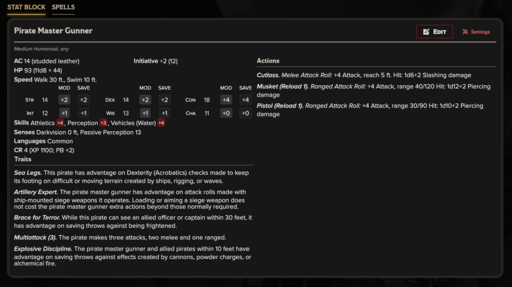 Whether you need disposable crew to crowd a boarding action, aggressive specialists to control rigging and firing lines, veteran enforcers to hold the deck under pressure, or a climactic pirate lord commanding the fight itself, Pirates provides mechanically distinct stat blocks at every tier of play. The ladder is designed to scale naturally, allowing pirate encounters to grow from chaotic skirmishes into full naval battles and campaign-defining confrontations. Firearms and artillery are fully supported through existing 5e rules, keeping the focus on tactics, positioning, morale, and leadership rather than magic.