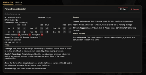 Pirate Swashbuckler (CR 1): Mobile duelist who relies on speed, footwork, and opportunistic strikes.