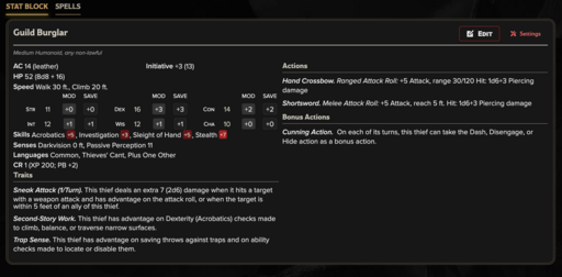 Guild Burglar (CR 1): Professional infiltrators who bypass locks, traps, and alarms. Prefer stealth and planning to open conflict.