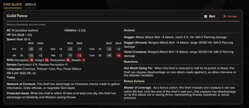 Guildmaster (CR 6): The unseen hand behind the guild’s operations. Rarely encountered directly, relying on preparation, leverage, and layered escape plans to survive.