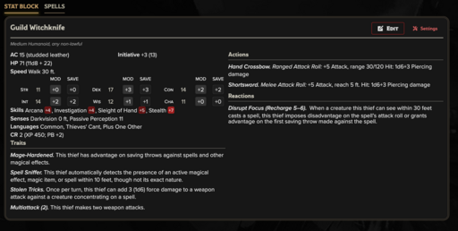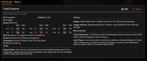 Whether you need disposable eyes to flood an alley, agile cutpurses to harass and scatter a crowd, brutal muggers to apply pressure, skilled infiltrators to bypass locks and wards, or a calculating crime boss directing the encounter from the shadows, Thieves’ Guild provides mechanically distinct stat blocks at every tier of play. The ladder is designed to scale naturally, allowing urban encounters to grow from petty crime and street violence into coordinated operations, territorial wars, and campaign-defining confrontations.