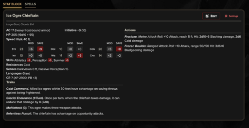 Ice Ogre Chieftain (CR 7): Seasonal war leader who plans raids around winter hardship, consolidating power across harsh and unforgiving landscapes.
