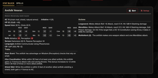 Whether you need organized tunnel defenders holding a chokepoint, expendable shock troops absorbing the first assault, elite myrmidons executing flanking maneuvers, or a hive marshal coordinating layered formations, Antfolk provides mechanically distinct stat blocks across multiple tiers of play. The ladder is built to scale naturally, allowing encounters to evolve from disciplined patrol engagements into full colony assaults where command structure, positioning, and formation integrity determine the outcome.