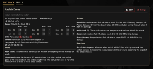 Antfolk Drone (CR 1/4): Expendable shock trooper bred for assault. Relies on natural claws and venom and willingly sacrifices itself to preserve hierarchy.