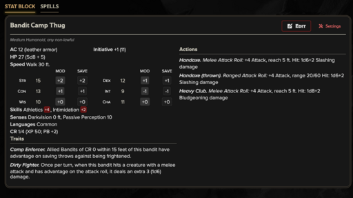 Bandit Camp Thug (CR 1/4): Brutal enforcer who settles disputes inside the camp through violence and fear.
