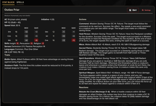 Outlaw Friar (CR 4): Boisterous warrior-preacher who inspires courage and fights with surprising strength.