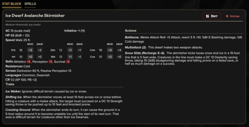 Ice Dwarf Avalanche Skirmisher (CR 1/2): Mobile warrior who uses unstable terrain and shifting snow to disrupt advancing enemies.