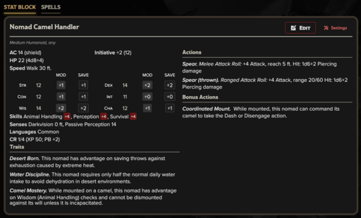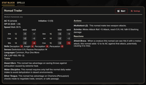 These NPCs are built to support a wide range of desert encounters: caravan negotiations, oasis diplomacy, trade disputes, escort missions, defensive shield formations, mounted skirmishes, and survival-driven expeditions. Combat exists, but it is secondary to social leverage and environmental control. Cultural details, faith, and political structure are intentionally minimal. Whether these nomads are honorable traders, pragmatic deal-makers, guarded isolationists, or regional power brokers is left to the GM. Use these stat blocks as tools. How and why the desert shapes them is yours to decide.