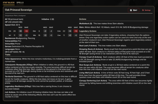 Oak Primeval Sovereign (CR 9): Colossal forest monarch whose roots and canopy dominate entire groves.