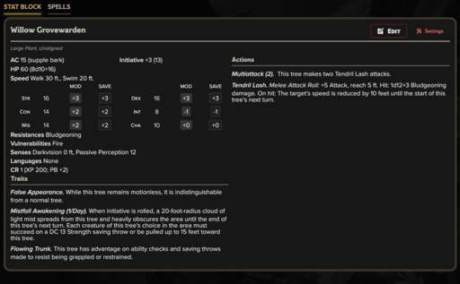 Willow Grovewarden (CR 1): Mist-shrouded guardian that drags enemies through fog and marsh terrain.