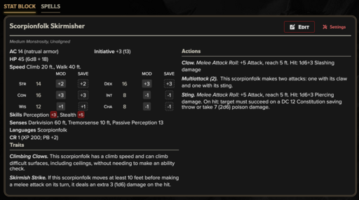 Scorpionfolk encounters reward awareness and positioning. Parties that remain grouped and alert can repel them, but scattered adventurers quickly become prey. Use these stat blocks as flexible desert threats, subterranean predators, or guardians of ancient ruins buried beneath shifting sands.