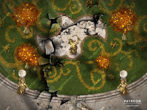 Huntress, don't miss, park is done, done done! A hallmark of civilization, hunting as an activity has long outlasted its necessity for nourishment. Has the Hunt been turned into a symbolic ritual by this advanced elven society, or are their culture still facing constant assault by fearsome foes that still require elimination by a caste of fearsome rangers? Fully animated and available in two additional variants, the beautiful park shattered by an earthquake, and with a violet hue to the lawn and trees, this garden map is the perfect place for a spot of dignified rest, or an explosive battle at the heart of an elven capital. Gonna be, gonna be golden!
