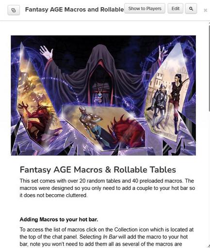 This add-on for your Fantasy AGE campaign gives you 20 random tables and 40 prebuilt macros to enhance your play experience on Roll20.