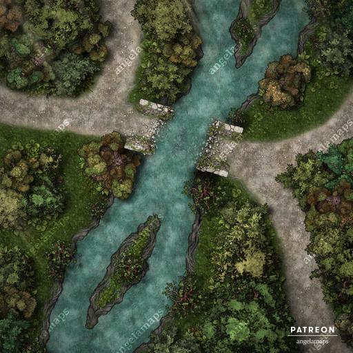 There are many rivers to cross, and if you can't find your way over this one, have you considered going over the bridge? Given the look of of the choppy waters beneath, that might be your best bet. Risks involve but are not limited to: brigands holding the bridge to extract undue tolls, trolls lurking beneath with some kind of goat fetish, and the river coming to life to bar your path. Fully animated and available in two additional variants, with the bridge tragically out, and in a winter wonderland, be sure to cross this map when you come to it!
